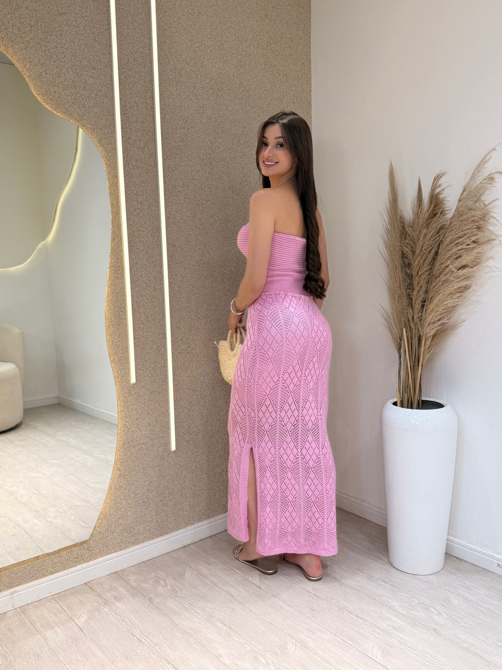 Modelagem: O Vestido Modal Sereia tem uma modelagem ajustada ao corpo na parte superior e na saia, que começa a se alargar abaixo dos joelhos, criando o estilo sereia clássico. Essa modelagem destaca as curvas femininas, oferecendo um visual sofisticado e elegante.